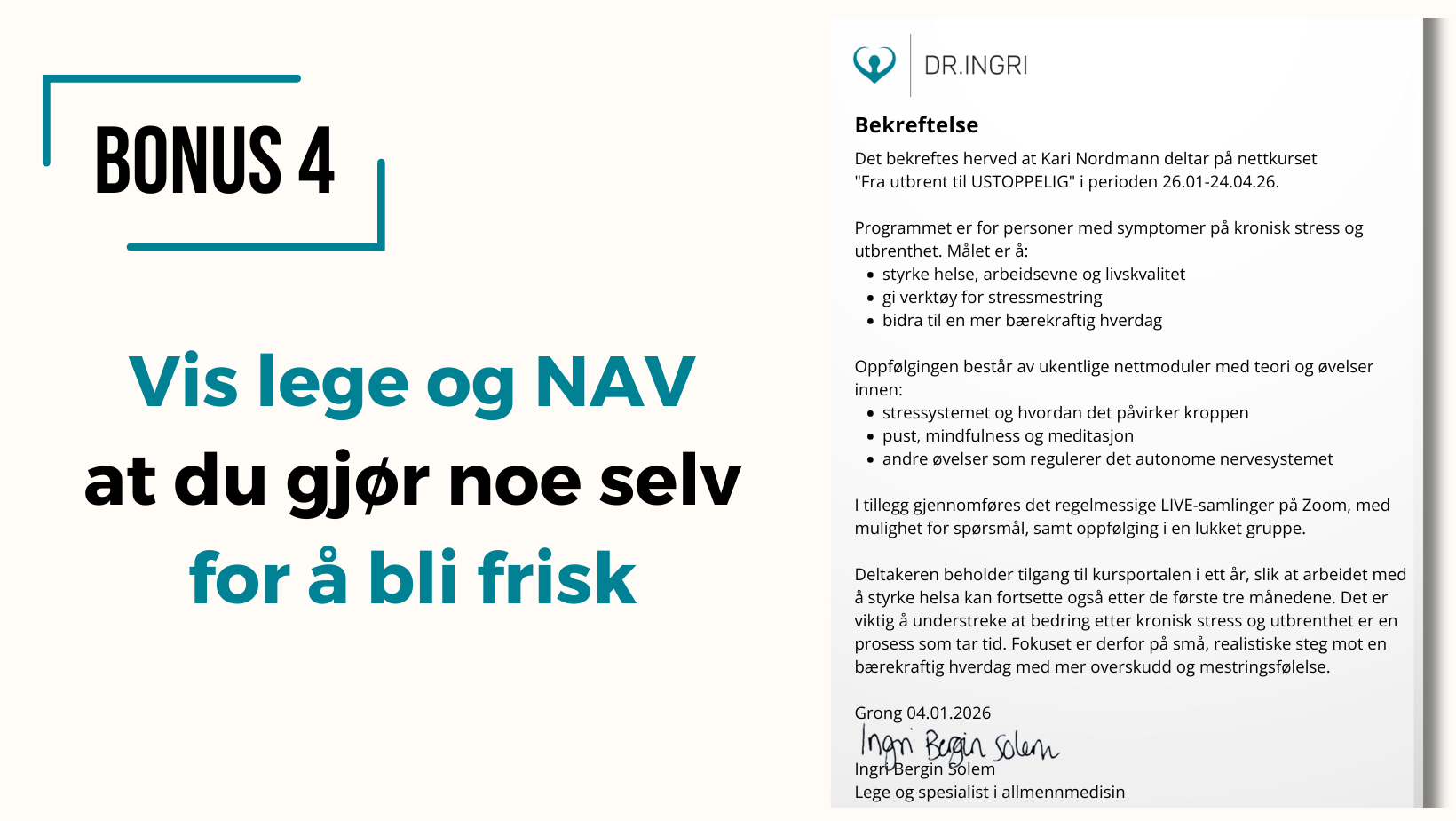 Etter denne modulen har du en klar plan for hva du skal gjøre fremover, både på de gode og de mindre gode dagene. Så du holder motivasjonen oppe, føler deg trygg på at du er på rette veg og kan ta steg for steg mot den hverdagen du vil ha.
