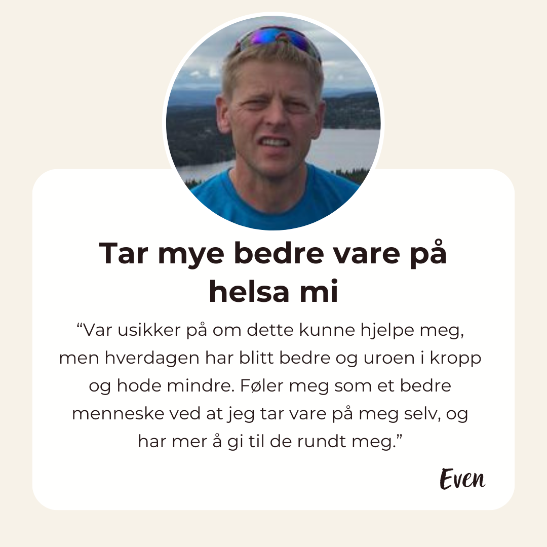 Etter denne modulen har du en klar plan for hva du skal gjøre fremover, både på de gode og de mindre gode dagene. Så du holder motivasjonen oppe, føler deg trygg på at du er på rette veg og kan ta steg for steg mot den hverdagen du vil ha.