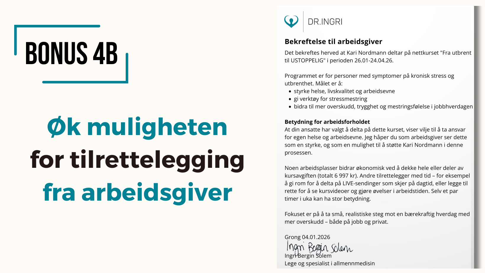 Dette minikurset er laget spesielt for deg som kjenner de første tegnene på utbrenthet og vil ta grep – før kroppen sier helt stopp. Og for deg som skal tilbake etter å ha vært ute av jobb i en periode. Her lærer du hvordan du kan sette sunne grenser og jobbe smartere, slik at du har energi igjen når arbeidsdagen er over.